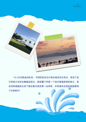 10.5日啟程返回杭州,可惜的是這次行程安排沒(méi)有太充分,高估了自 己的體力沒(méi)有去集美區那邊,感覺(jué)廈門(mén)市是一個(gè)適合慢慢游覽的地方,我 去的時(shí)間真的太熱了建議春天或涼爽一點(diǎn)再來(lái),非常喜歡這里的氛圍期待 下次的旅行! 40