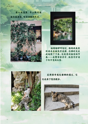 第二日清晨,平江路石板 被晨露濡濕,映著(zhù)初醒的天光。 搖櫓船咿呀劃過(guò),船娘的吳歌 軟語(yǔ)在水面蕩開(kāi)漣漪,仿佛時(shí)光在 此地慢了下來(lái)。這是蘇州獨有的節 奏——在繁華市井中,依然守護著(zhù) 千年不變的從容。 在西園寺遇見(jiàn)慵懶的貓兒,它 們在廊下悠然踱步。 55