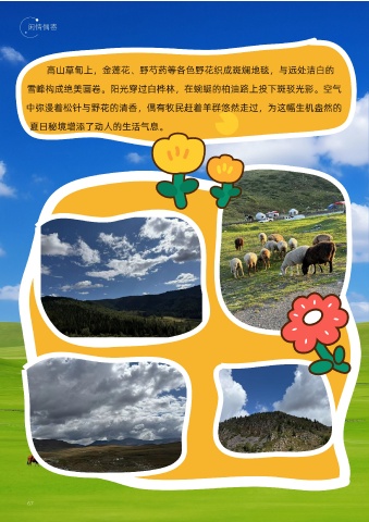 高山草甸上,金蓮花、野芍藥等各色野花織成斑斕地毯,與遠處潔白的 雪峰構成絕美畫(huà)卷。陽(yáng)光穿過(guò)白樺林,在蜿蜒的柏油路上投下斑駁光影??諝? 中彌漫著(zhù)松針與野花的清香,偶有牧民趕著(zhù)羊群悠然走過(guò),為這幅生機盎然的 夏日秘境增添了動(dòng)人的生活氣息。 67